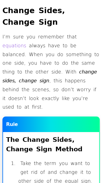 • How to Solve Equations (Change Sides, change sign)