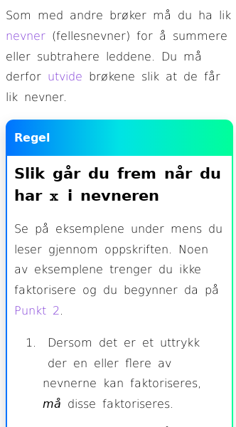 Oppslag om Pluss og minus av brøker med x i nevneren