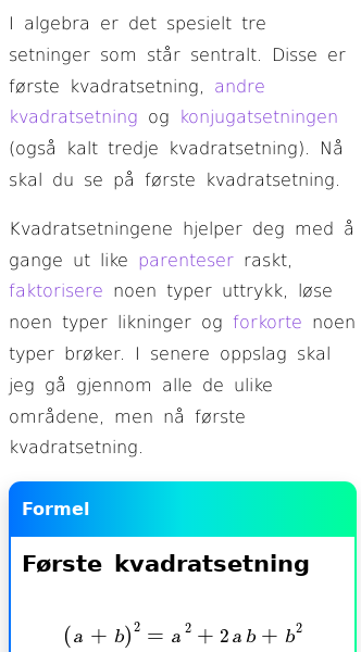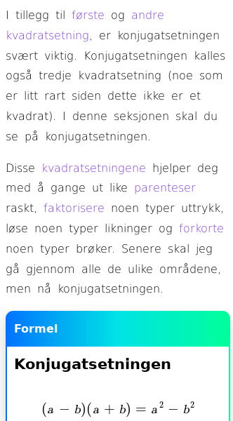 • Hva er konjugatsetningen eller tredje kvadratsetning?