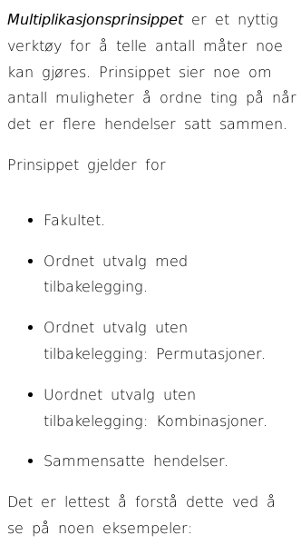 • Multiplikasjonsprinsippet for antall muligheter